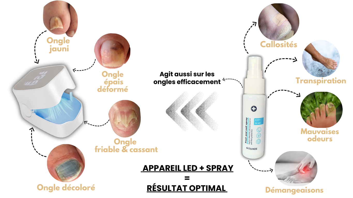" Depuis plus de 5 ans ma mycose au niveau du gros orteil persistait, j'y croyais pas trop mais j'ai essayé le pack appareil Led + spray et ça marche ! En moins de 2 mois je constate une nette amélioration elle a quasiment disparu ! "